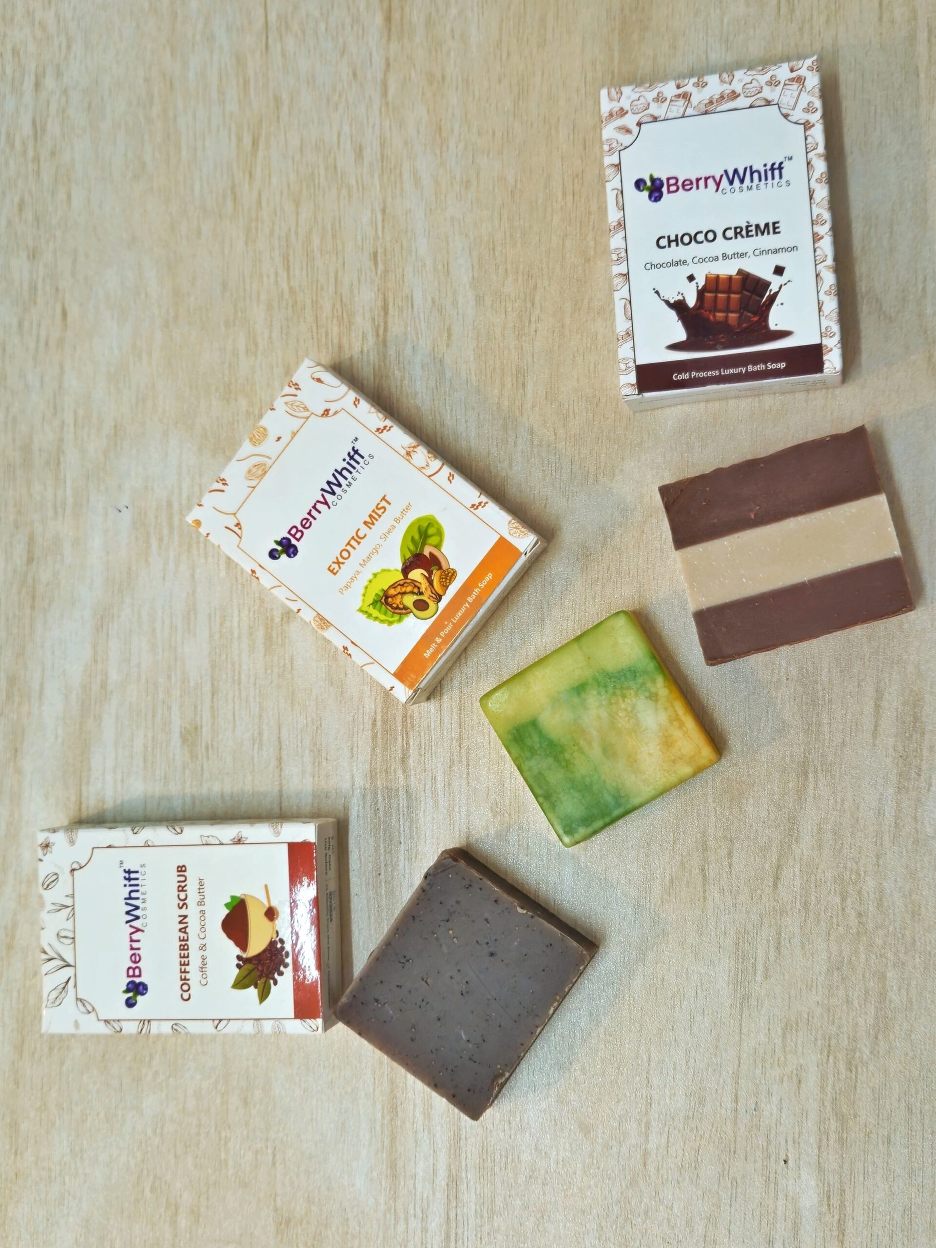 BerryWhiff Cosmetics – Exotic Mist Soap, Choco Creme Soap & Coffee Bean Scrub (Pack of 3)