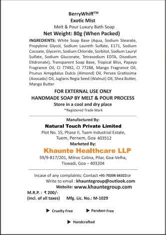 White Soap Base (Aqua, Sodium Stearate, Propylene Glycol, Sodium Laureth Sulfate, EDTA, Sodium Cocoate, Glycerin, Sodium Chloride, Sorbitol, Sodium Lauryl Sulfate, Sodium Stearate, Tetrasodium EDTA, Disodium Etidronate), Transparent Soap Base, Tropical Bliss, Papaya Fragrance Oil, CI 77492, CI 77288, Mango Fragrance Oil, Purifying Dullness (Mint) Oil, Pure Grapeseed (Avocado) Oil, Juglans Regia Seed (Walnut) Oil, Shea Butter, Mango Butter